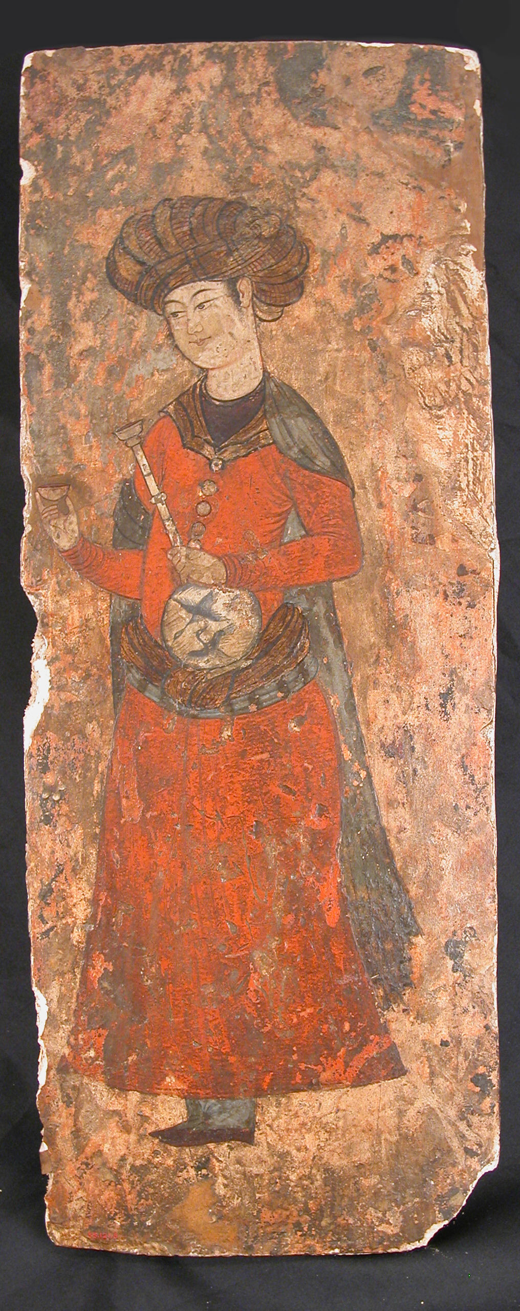 A Safavid mural painting of a beautiful youth holding a wine bottle and cup—the idealized cupbearer of the Persian court, a figure of desire and refinement.