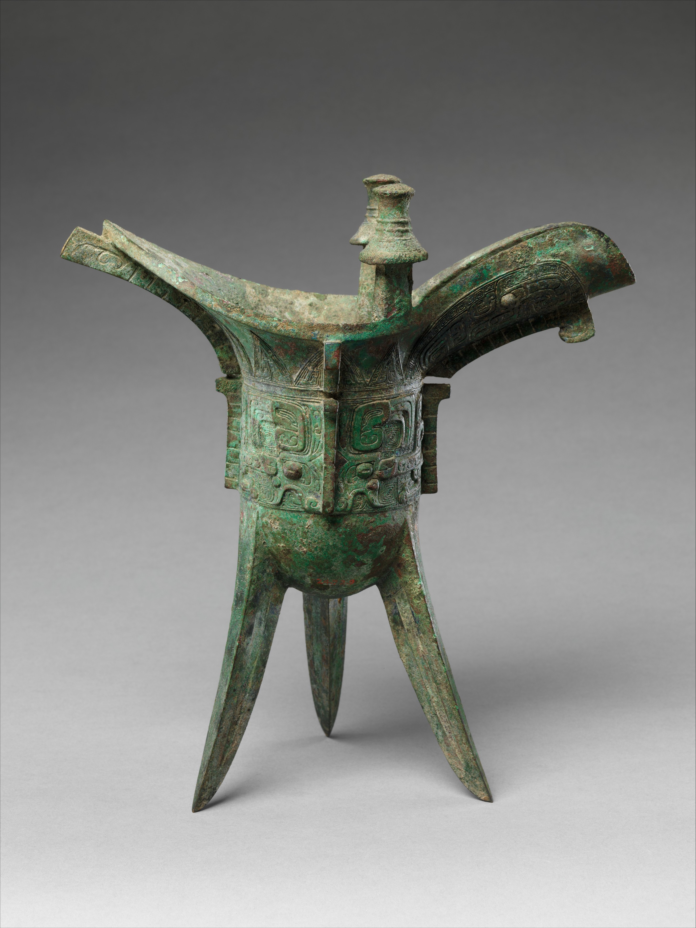 A Chinese bronze ritual wine vessel (jue) from the late 11th century BCE, part of an elaborate set used in Shang and Zhou ceremonial rites—evidence of wine's sacred role in ancient Chinese civilization.