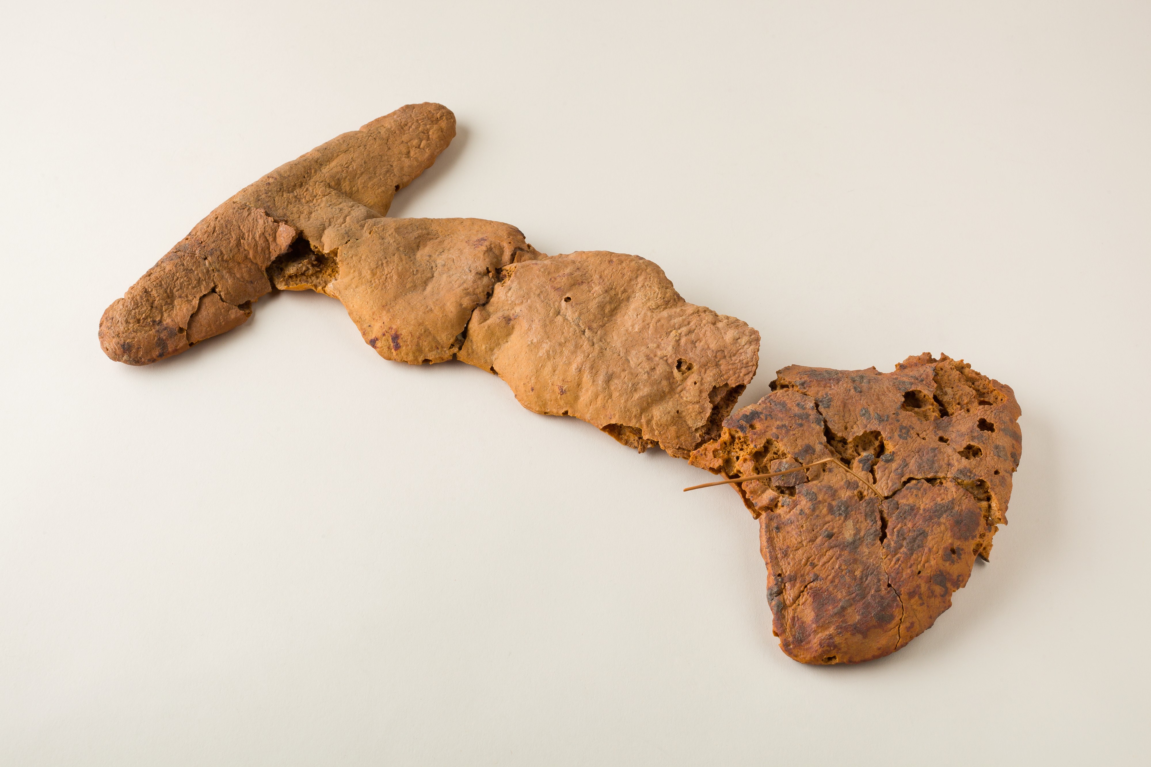 An unusually shaped loaf of bread found in the tomb of Hatnefer, with other food offerings including dates and raisins.
