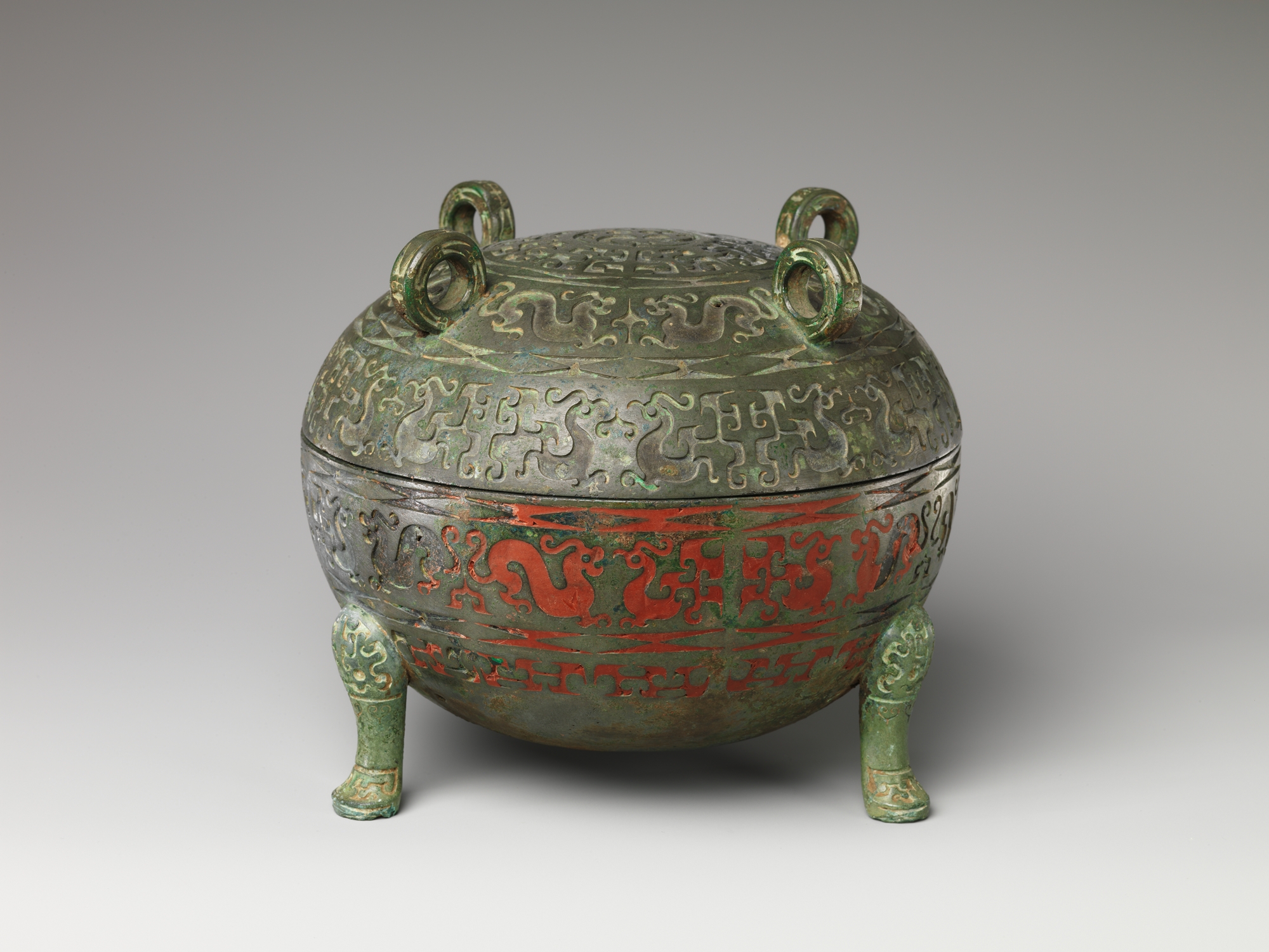 A bronze grain-serving vessel (dui) with reserved ornamentation meant to be filled with colored inlay.
