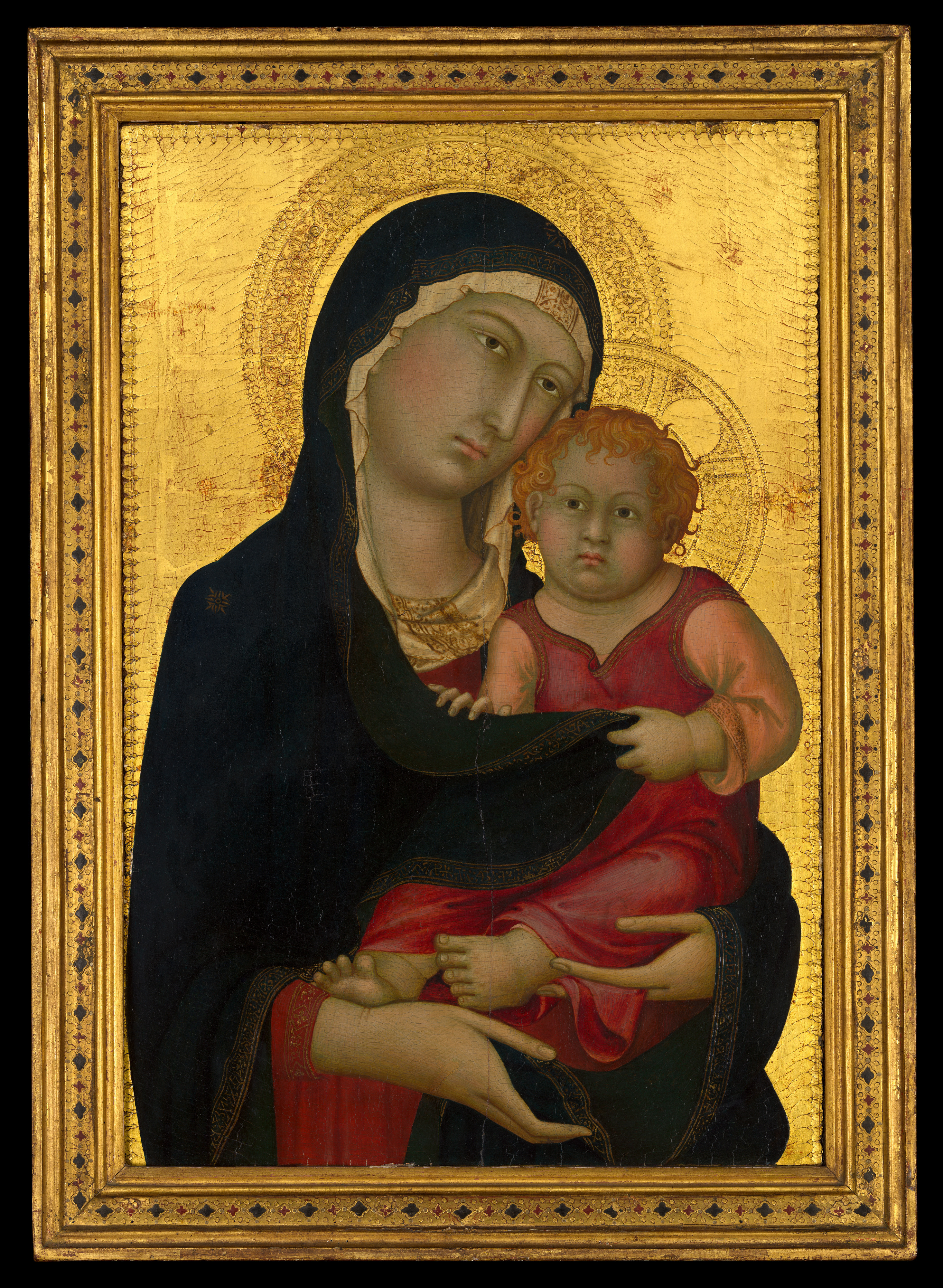 Simone Martini's masterpiece from 1326 shows the Virgin and Christ Child in an intimate embrace, their tender connection expressed through delicate foreshortening and the serpentine curve of Mary's mantle.