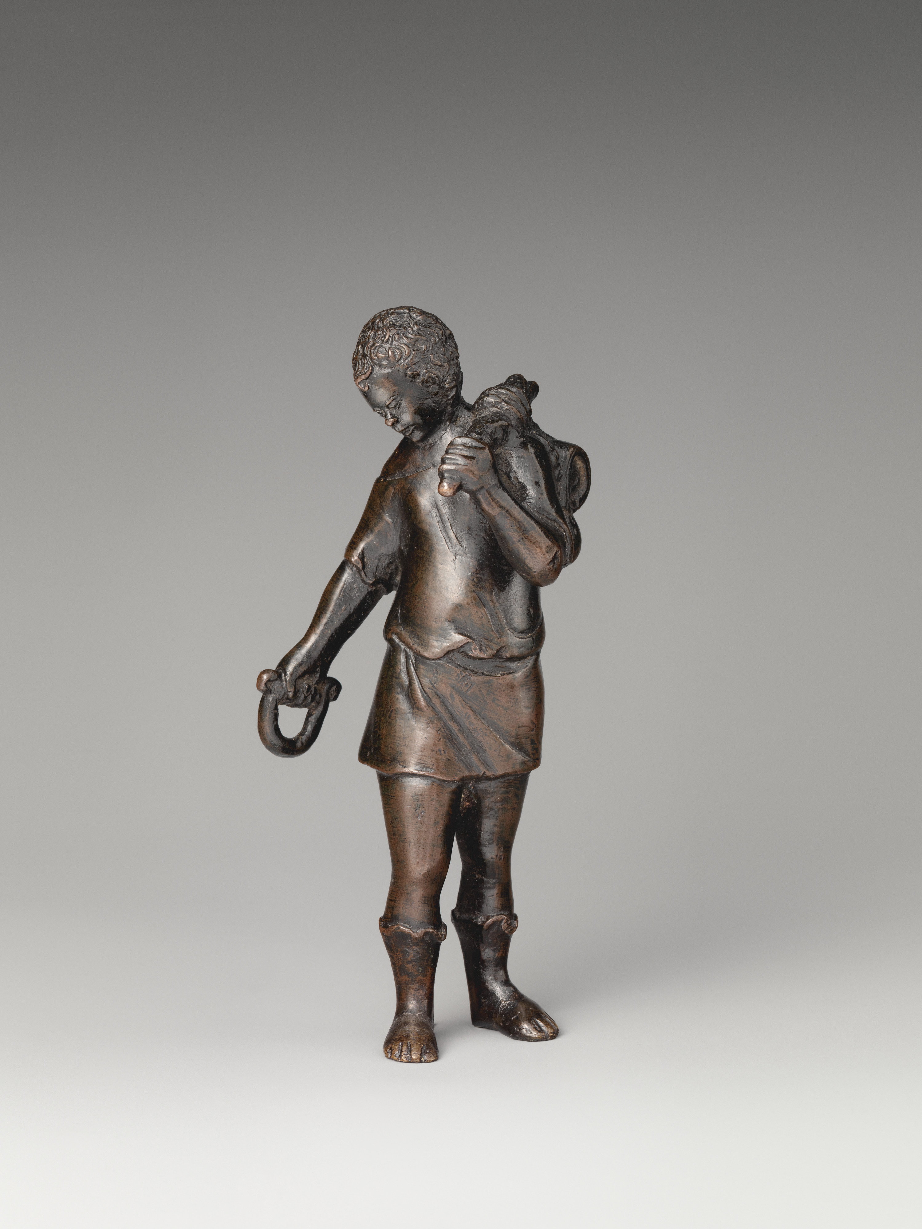 Stay in Gallery 537. This bronze figure is displayed here, showing another example of how Renaissance sculptors depicted children in narrative and functional contexts.