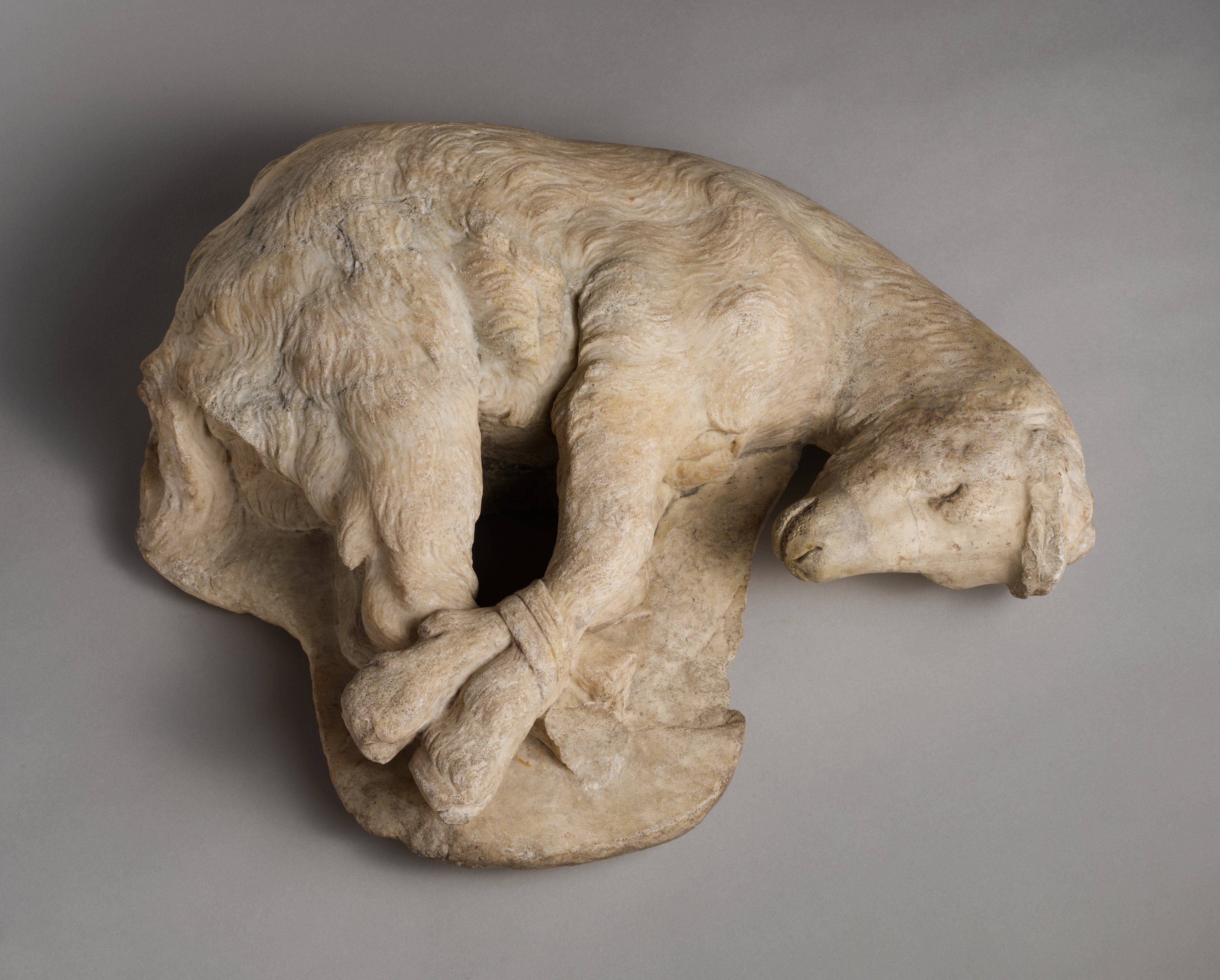 A marble statue of a bound goat from Roman times, 1st–2nd century CE, likely a votive offering to a rustic deity.