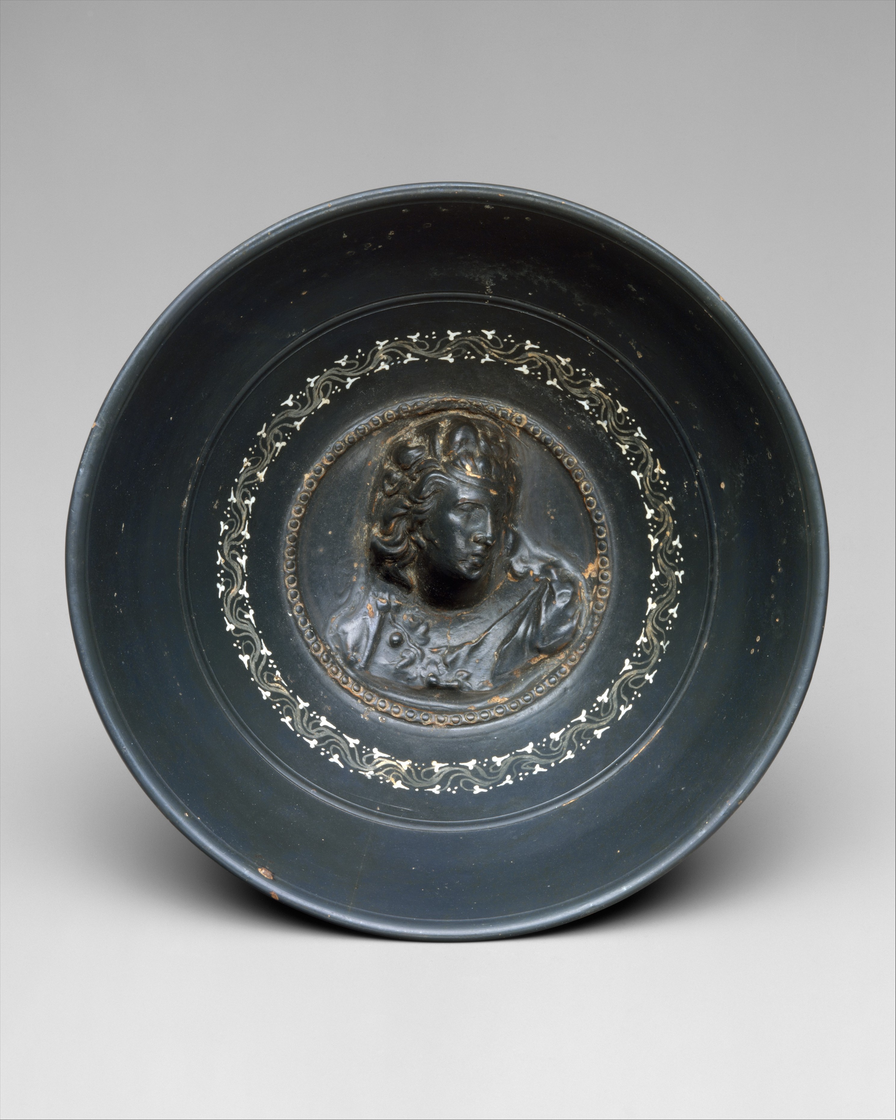 A deep bowl decorated with a bust of Dionysos, the god of wine himself, showing how wine vessels became tributes to the deity.