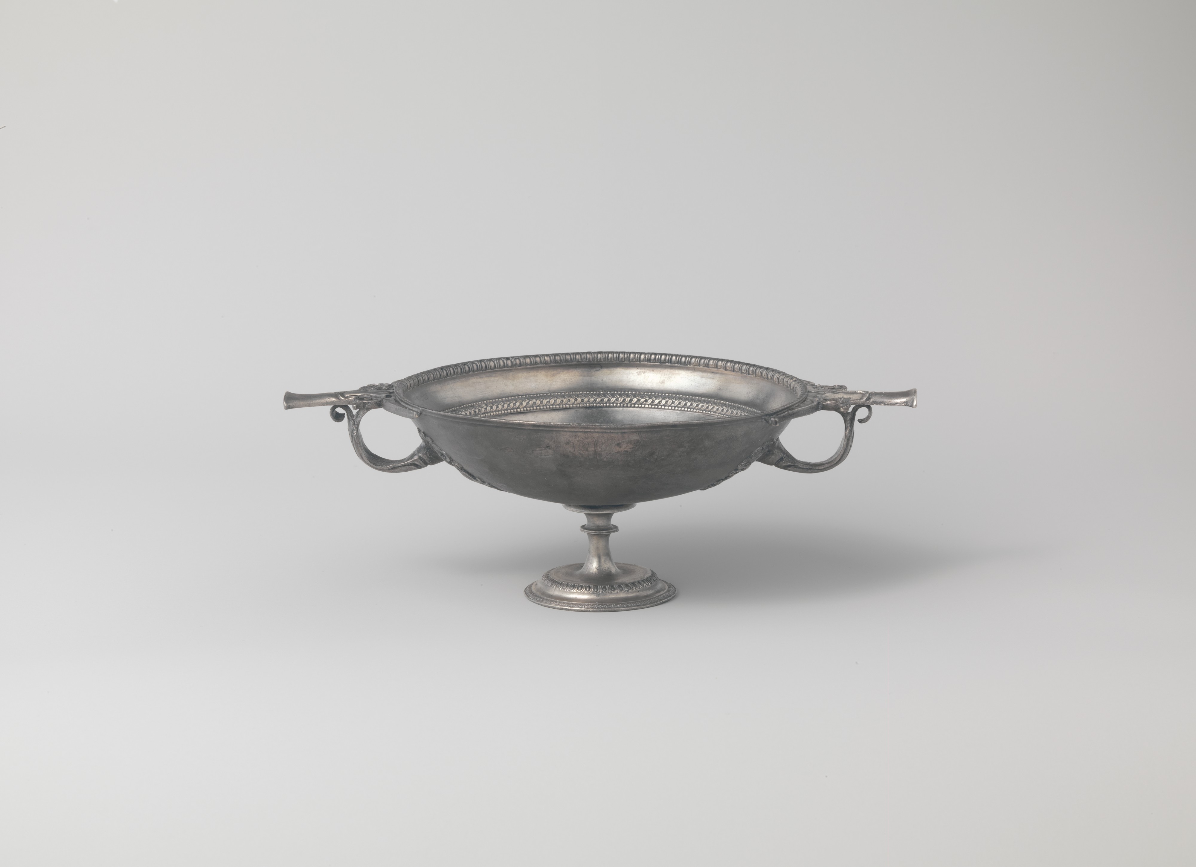 A silver drinking cup with palmette-decorated handles, one of a matching pair from the 1st century BCE–1st century CE, exemplifying Roman luxury tableware.
