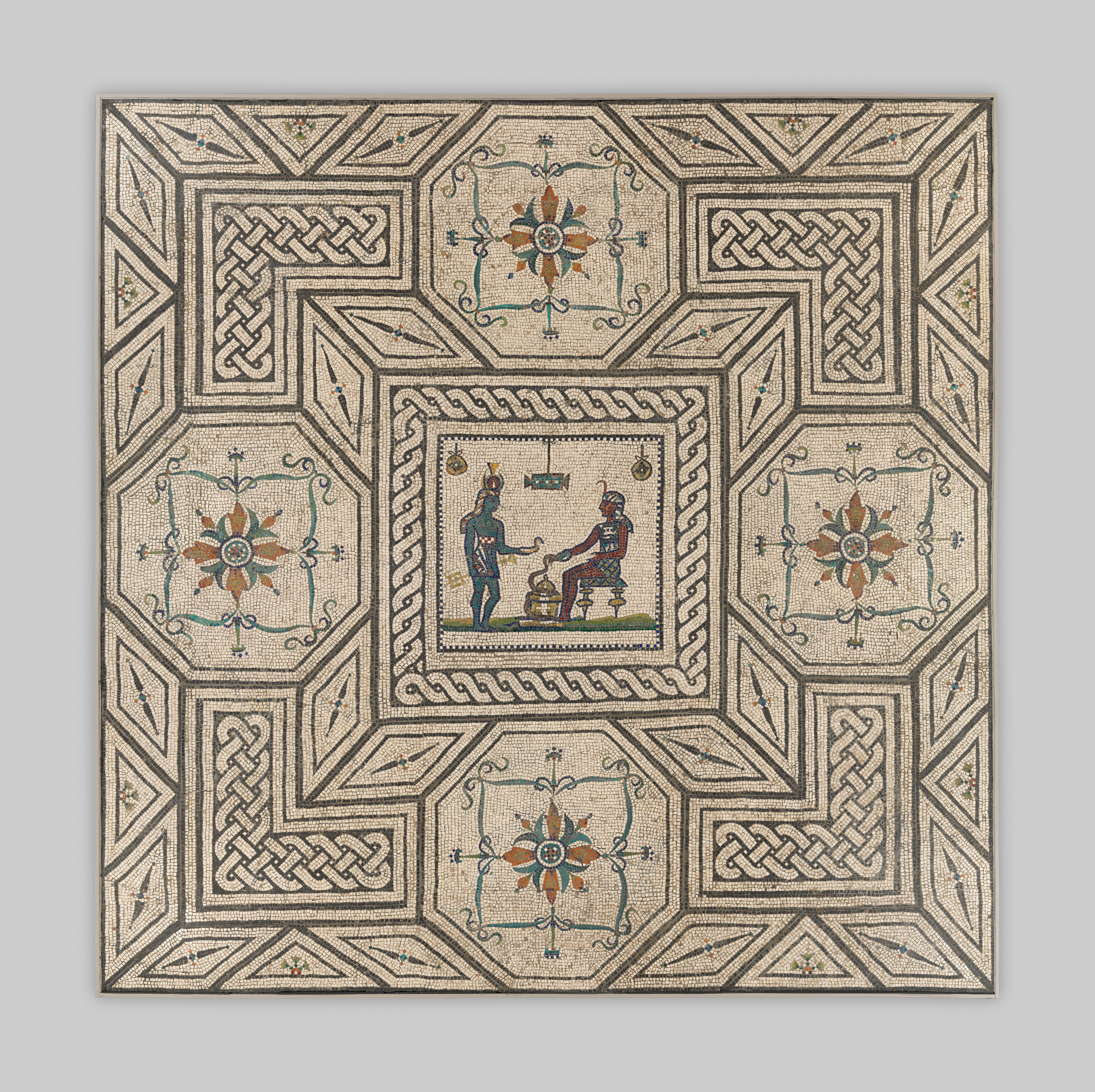 A mosaic floor from a wealthy Roman villa near Rome, depicting an Egyptian-inspired scene and surrounded by geometric patterns that adorned the dining spaces of the elite.