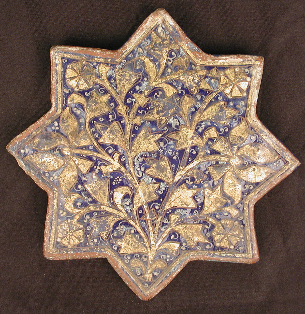 Three lajvardina tiles, 13th–14th century. Eight-pointed star tiles with lotus and peony blossoms, gold leaf, and overpainting.