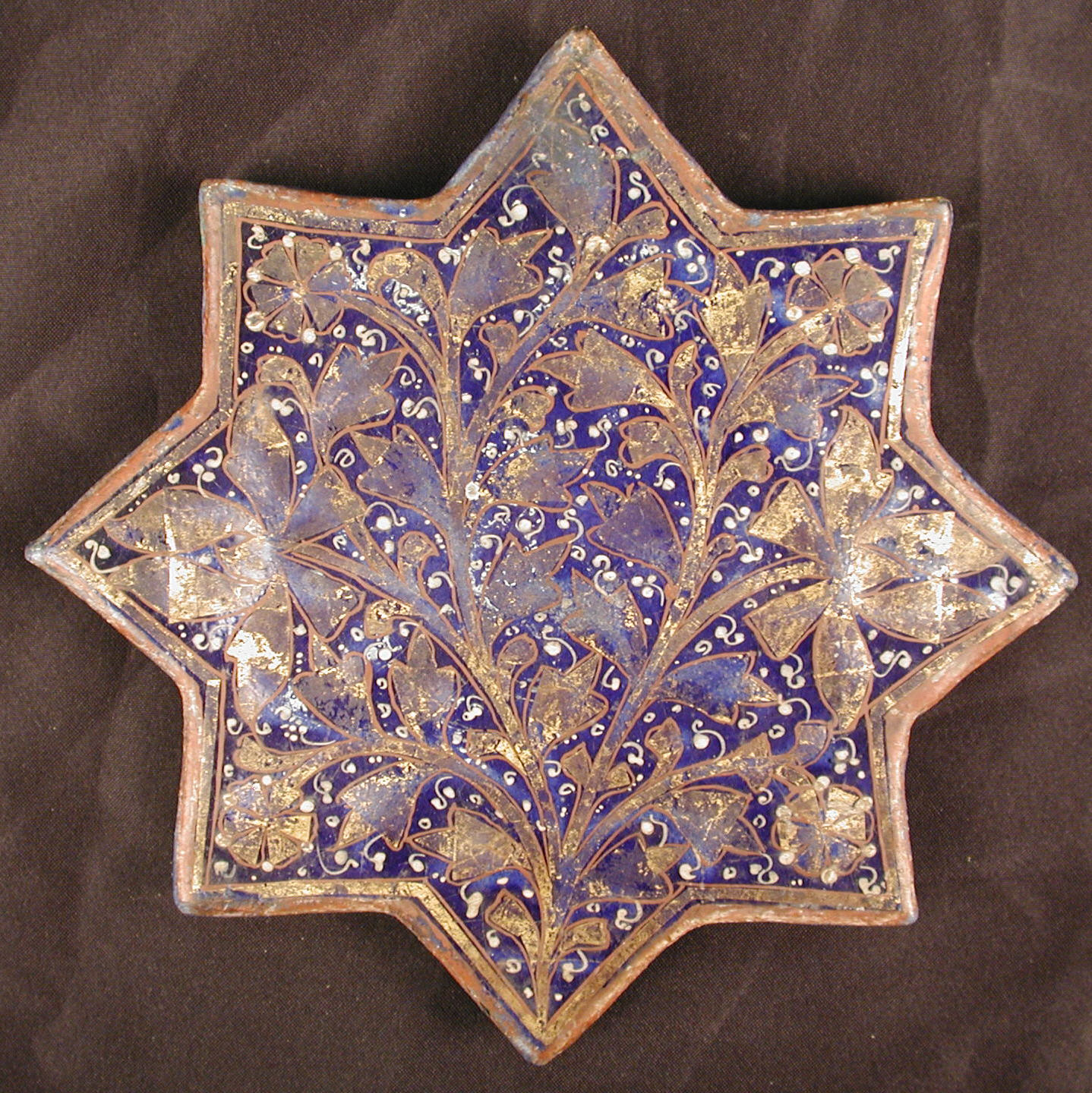 Star-shaped lajvardina tile, 13th–14th century. Eight-pointed star with lotus and peony blossoms, gold leaf, and overpainting.
