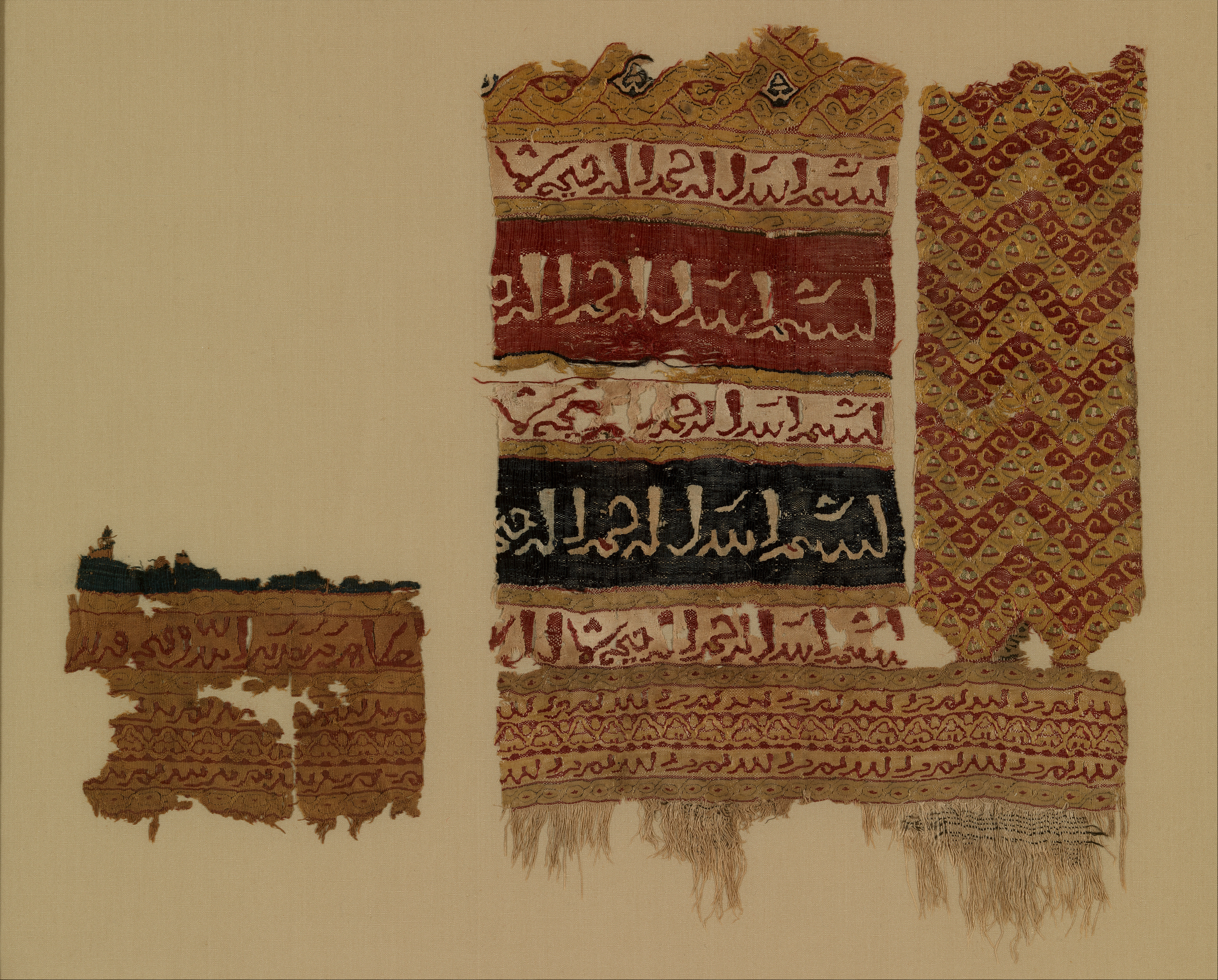 Textile with Arabic inscriptions from Egypt, 12th century. Tapestry-woven with religious text and decorative patterns.