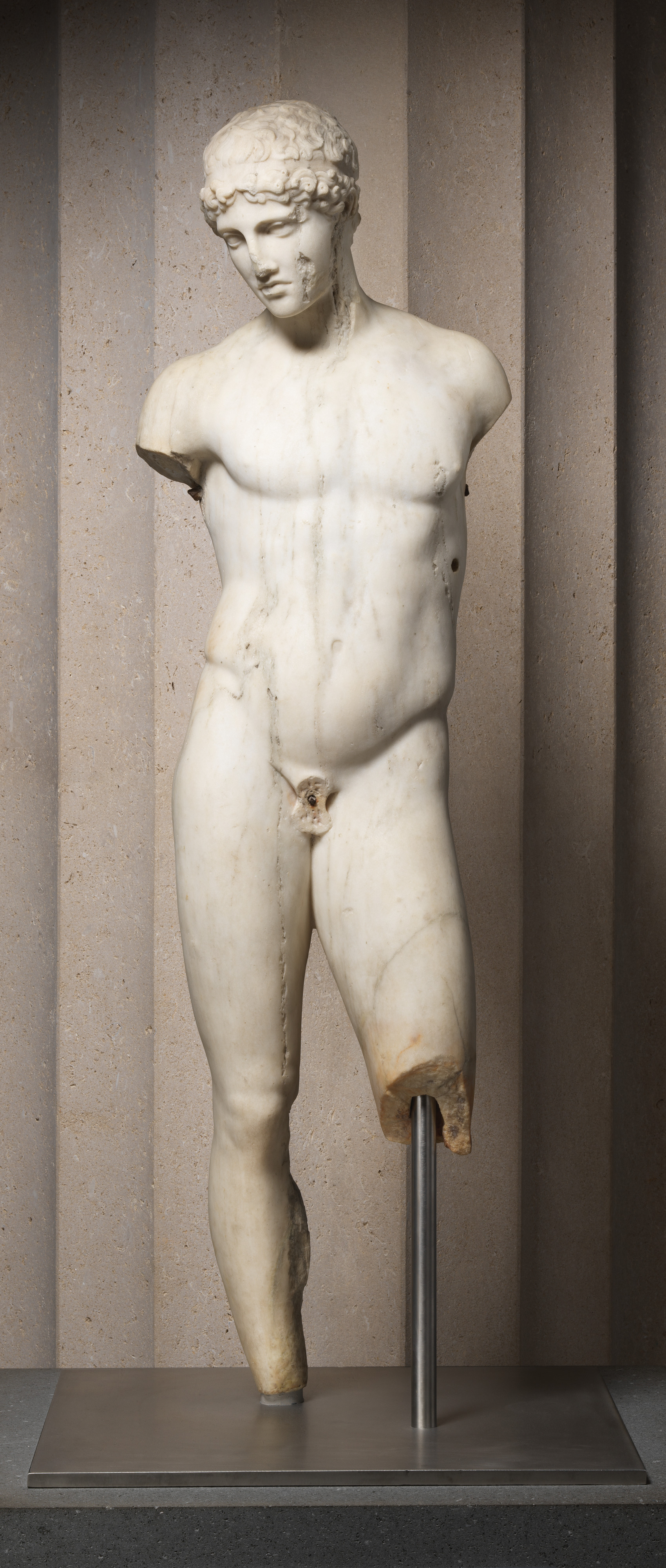 A Roman marble statue of a youth from the 1st century CE, a copy of a Greek original celebrating athletic victory and classical beauty.