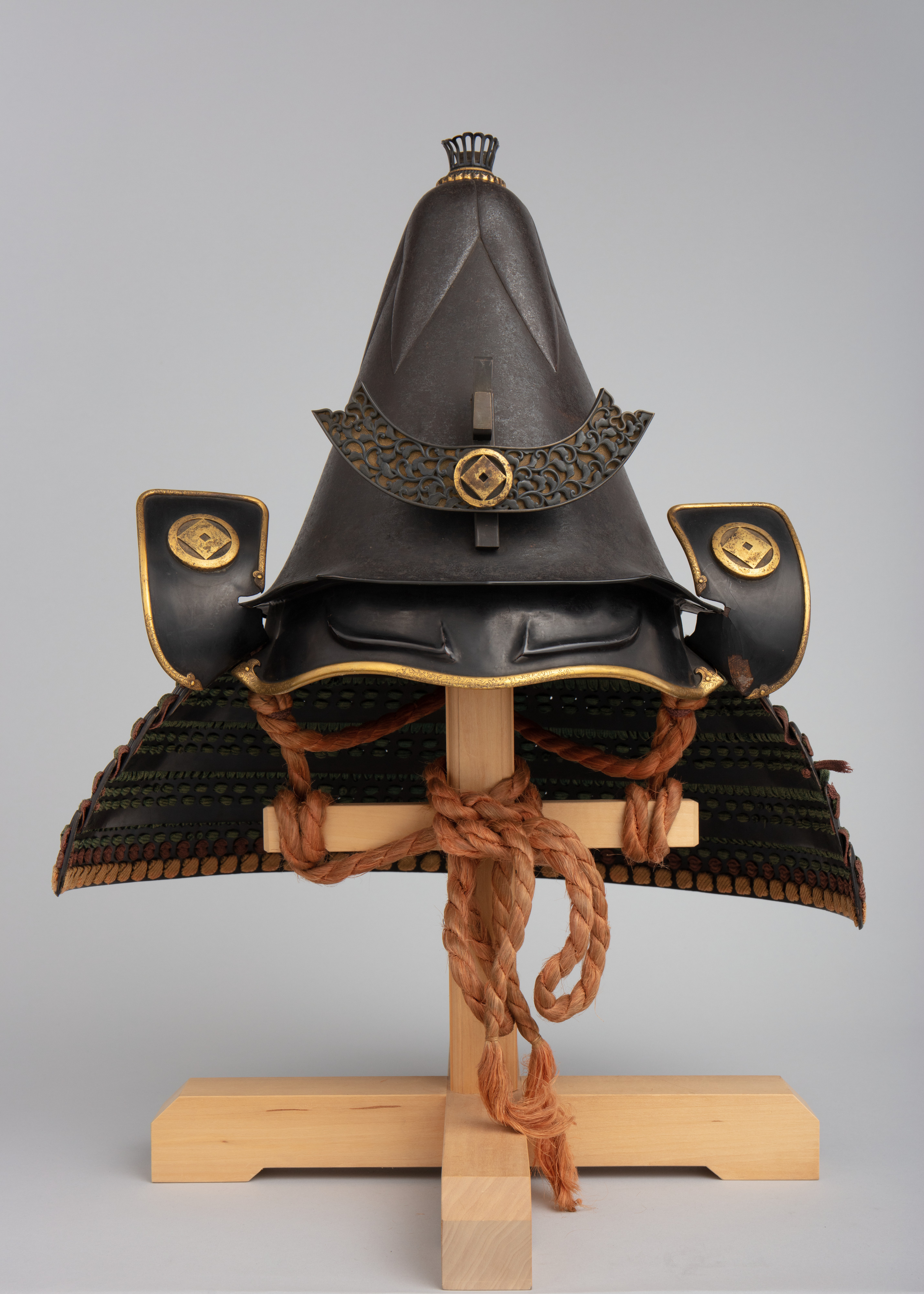 Japanese helmet shaped like an eggplant with red lacquered neckguard, 17th century